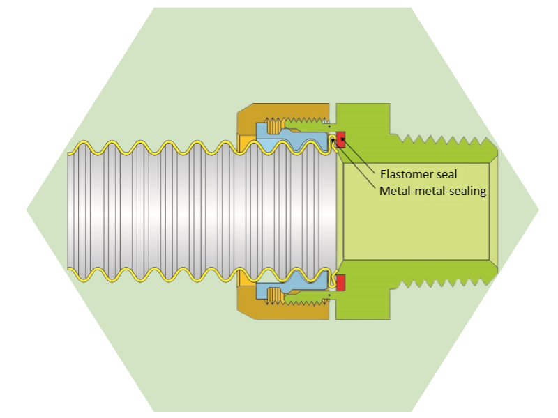 With our TERRA+ system, we are launching a completely new product on the market: pre-insulated, high-temperature-resistant stainless steel corrugated pipes for air-to-water heat pumps. Additional lengths of 25–30 cm, depending on the dimensions of the corrugated pipes, ensure maximum system flexibility. Thanks to the well-known double seal technology of the fittings, you also benefit from quick and secure installation. No additional tools, such as press pliers or similar, are required.