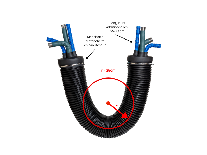 Les tuyaux équipés de TUBES ONDULEUX PLIABLES en acier inoxidable avec des allonges de 25cm de chaque côté en