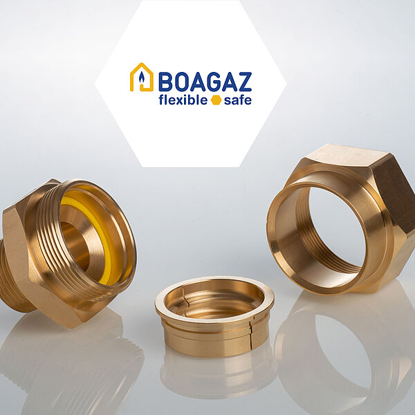 Il corpo, il dado per raccordi ed i semianelli costituenti i raccordi e i giunti BOAGAS® sono prodotti in ottone conforme a EN 12164/65, mentre la guarnizione è in elastomero conforme a EN 549, le filettature sono conformi alla UNI EN 10226.